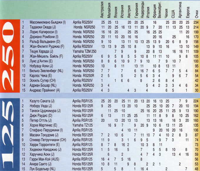 И все же у европейских болельщиков, несмотря на впечатляющее шествие японских пилотов, жива надежда, что чемпионат мира "осьмушек" не превратится в открытое первенство Японии. В классе 125 см³ появилась новая звезда — Стефано Перуджини. В середине сезона итальянец, между прочим чемпион Европы в этой кубатуре, на своей "Априлии" не давал спуску японцам. И хотя ни одного Гран-при Стефано выиграть не удалось, виной тому отсутствие опыта, что в 18 лет вовсе не зазорно. Но то, что вытворял Перуджини на заключительных этапах первенства, не поддается описанию. Итальянец лидировал, его мотоцикл стаскивало с трассы, он возвращался на нее, догонял ушедших вперед конкурентов, опять выходил в лидеры и снова падал.