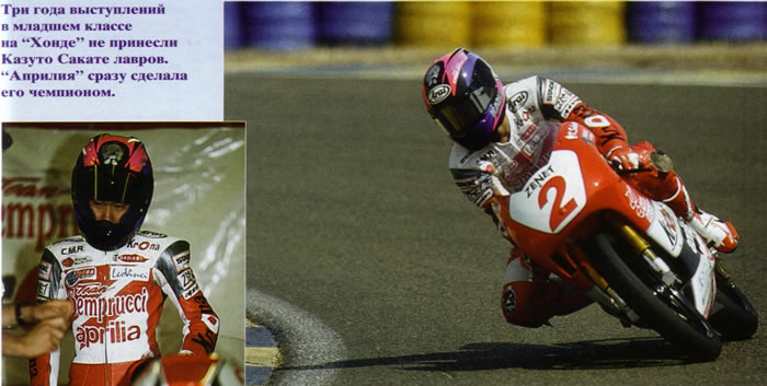 Однако еще большее счастье выпало на долю рекламного отдела самой "Априлии" — ведь ее мотоцикл стал первым и в классе 125 см³. Единственная победа "прекрасной итальянки" в сезоне-93 и все возраставшая экспансия японских пилотов в младшем классе подвигли "Априлию" к необычному, если не сказать экстравагантному шагу. "Раз уж соперника нельзя победить, то его силу можно использовать", — решило руководство команды "Семпруцци-Крона", пользующейся поддержкой итальянского завода, и переманило в свой стан вице-чемпиона мира Казуто Сакату. Представляете — японец на мотоцикле с пометкой "сделано в Италии". О таком раньше и не помышляли. Саката стал первым в истории гонщиком из Страны восходящего солнца, выступающим за европейскую команду.