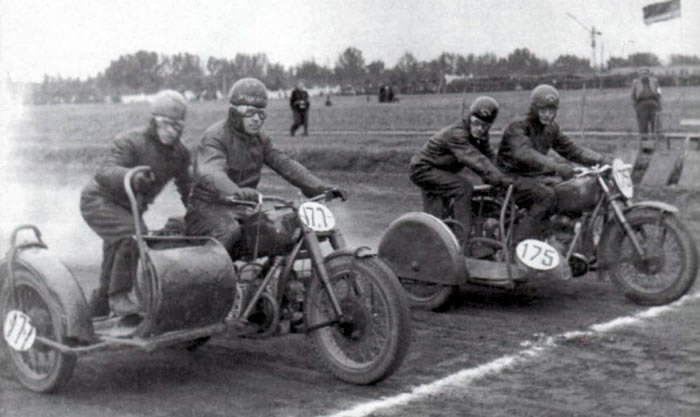Этот снимок сделан в 1955 году в Бухаресте, где проходила Спартакиада дружественных армий. В ее программе были и моторные виды соревнований, и вот такие необычные ипподромные гонки на мотоциклах с коляской. Советские армейцы использовали здесь М-72 (на переднем плане) и только что появившиеся ижевские машины с верхнеклапанным двигателем.