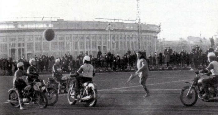 В 1962 году в Лужниках состоялся фестиваль автомобильных и мотоциклетных соревнований, главным арбитром которых был Ю. Гагарин. Тогда москвичи впервые познакомились с мотоболом. В следующем сезоне этот вид спорта с помо/цью журнала "За рулем" получил официальное признание. Чемпионаты СССР по мотоболу стали проводиться с 1965 года.