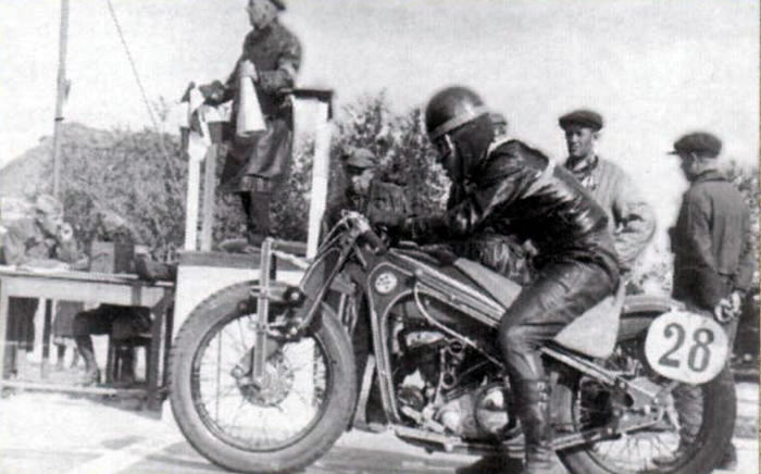 Гордость советского мотоспорта Евгений Грингаут одержал столько побед в кроссе, кольцевых и линейных гонках, что их даже трудно перечислить. Он был не только выдающимся спортсменом, но и конструктором. В его руках обычный дорожный мотоцикл — будь-mo отечественный или зарубежный — превращался в образец гоночной техники того времени. И еще он слыл великолепным автомобилистом. Евгений Грингаут — на старте чемпионата СССР по линейным гонкам под Киевом в 1937 году на ПМЗ-750.
