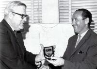 Член правительства Австралии вручает капитану советской сборной Александру Ипатенко награду за четвертое место в ралли-марафоне "Лондон—Сидней". Наша команда, одна из немногих, финишировала в полном составе.
