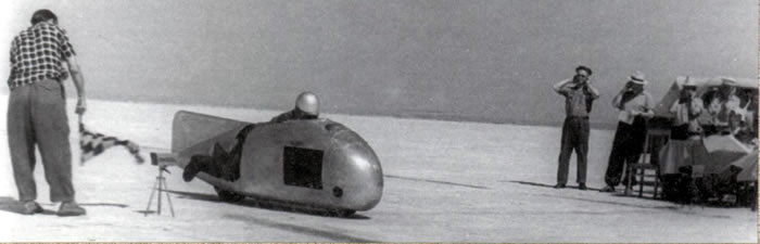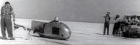 Высохшая соленая гладь озера Баскунчак. Здесь в начале 60-х годов проводились заезды на установление международных и всесоюзных рекордов скорости. Финиширует москвич Александр Новиков на мотоцикле Н-100. Обтекатель и 100-кубовый двигатель собственной конструкции гонщика, картер от ИЖ-350, П-образный цилиндр, водяное охлаждение с нагревателем. Судьи зафиксировали среднюю скорость в 162 км/ч.
