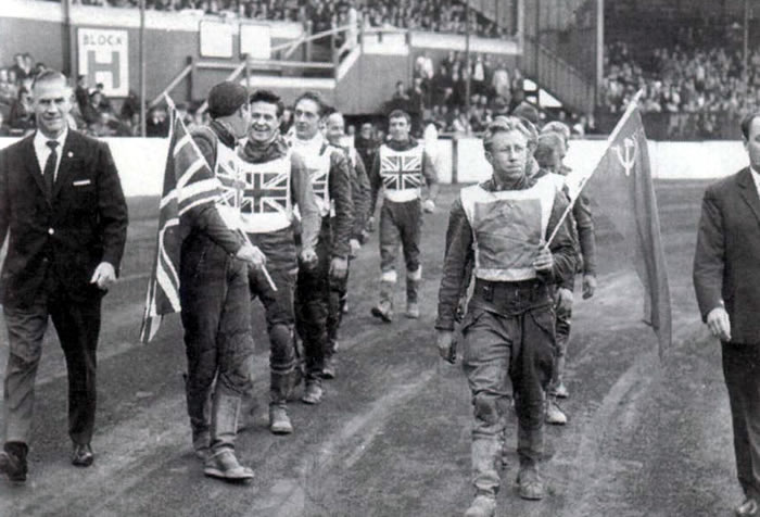 В 1965 году сборная СССР по спидвею совершила турне по Шотландии и Англии. О таком мы сейчас не можем и мечтать, а тогда это было нормой. На снимке — открытие соревнований в Глазго. С советским флагом Игорь Плеханов, справа — руководитель делегации А. Ипатенко. В состав наше/i команды входили уфимцы Б. Самородов, Г. Кадыров, Г. Куриленко, Ф. Шайнуров и другие известные мастера.