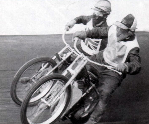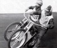 Эпизод гонки в Глазго. Игорь Плеханов (на переднем плане) опережает в повороте соперника из Англии. Обратите внимание на маску Игоря. Тогда все наши гонщики шили их сами, оберегая лицо от гаревого шприца из-под колес идущего впереди мотоцикла. Такая мода продержалась недолго.