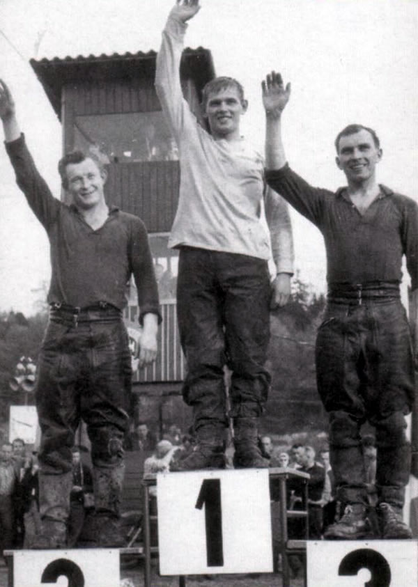 Чемпионаты мира по мотокроссу в классе машин 250 см³ начали проводить с 1962 года. И первым золотым лауреатом стал швед Торстен Халльман на "Хускварне". Он еще трижды (в 1963, 1966 и 1967 годах) становился чемпионом. Этот снимок, сделанный 33 года назад в Испании, запечатлел необычную манеру езды знаменитого шведа — всю дистанцию он преодолевал, стоя на подножках мотоцикла.